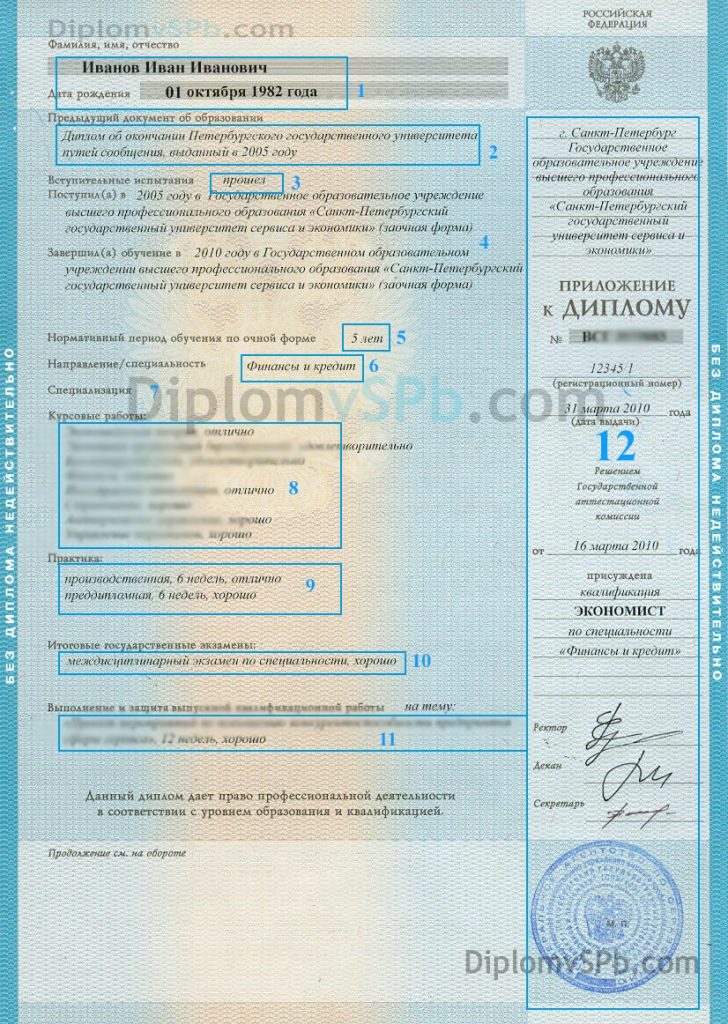 №3 В верхней части правой стороны бланка диплома указывается город или населенный пункта (в примере: г. Санкт-Петербург), где находится вуз, и официальное название вуза в именительном падеже, согласно уставу данного высшего учебного заведения (в примере: Государственное образовательное учреждение высшего профессионального образования «Санкт-Петербургский государственный университет сервиса и экономики» ).